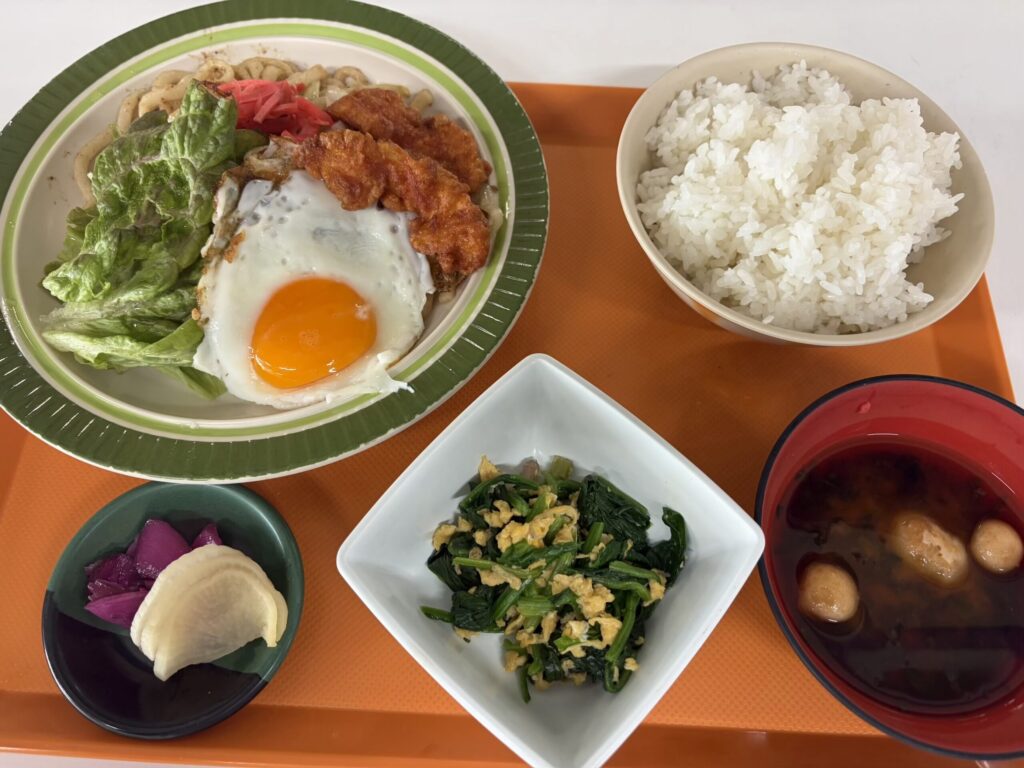 焼うどんと目玉焼き とり天