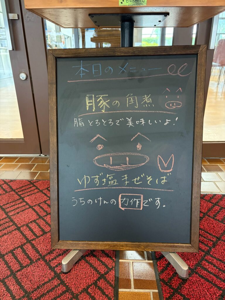 2025 1105 最新情報 本日のメニュー 岐阜県安八郡神戸町で工場給食を提供させていただいております。株式会社イトキューです。今日のメニューです。 定 食 豚の角煮 揚げギョーザ すまし汁 麵 類 ゆず塩まぜそば 厚揚げの明太みそのっけ グ リ ル すみこの特製から揚げ すみこお手製ポテトサラダ 昆布豆 香の物 お味噌汁 食堂の入り口に黒板を設置しました。 絵心のないあたしにうちの調理スタッフが書いてくださいと。…いかがでしょうか? 本日のメニュー 前の記事 本日のメニュー 次の記事